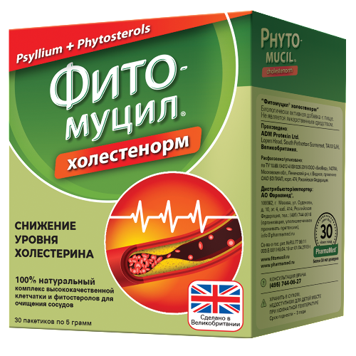 Проходя по кишечнику, Фитомуцил Холестенорм связывает и выводит жиры и холестерин, поступившие с пищей, что уменьшает поступление холестерина из кишечника в кровь и понижает уровень «плохого» холестерина. Фитостеролы дополняют действие клетчатки, блокируя всасывание холестерина в кровь. Фитомуцил Холестенорм замедляет всасывание в кровь простых сахаров, что уменьшает резкие колебания уровня глюкозы крови и способствует лучшему контролю гликемии у лиц с сахарным диабетом 2 типа и нарушениями углеводного обмена.