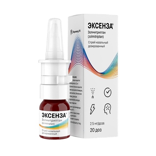 Пациентам, принимающим препараты ингибиторы СУР 1А2, такие как флувоксамин и хинолоны (например, ципрофлоксацин), максимальная суточная доза составляет 5 мг. Путь и (или) способ введения Препарат Эксенза применяется интраназально (впрыскивание в нос). Перед применением препарата Эксенза следует прочистить ноздри (мягко высморкаться). Перед первым применением препарата следует несколько раз нажать на дозатор-распылитель, направляя брызги в воздух, пока не сформируется равномерное облако спрея. Если после последнего применения препарата прошло более четырех недель, первое распыление следует сделать в воздух для предотвращения применения неполной дозы. В период между использованиями флакон с препаратом следует хранить с плотно закрытым колпачком. При применении флакон следует держать распылителем вверх. Наклонить голову немного вперед, распылитель ввести в ноздрю, слегка наклонив кончик распылителя от центра носа, и сделать одно нажатие. В случае необходимости повторить то же самое с другой ноздрей. Приступ мигрени с аурой и без ауры Впрыскивания препарата (одной или нескольких доз) могут быть выполнены в любую ноздрю. Приступ кластерной головной боли Пациенты с приступом кластерной головной боли могут ощущать заложенность носового хода на стороне локализации боли. В таких случаях впрыскивания препарата рекомендовано выполнять в ноздрю, расположенную на противоположной стороне.