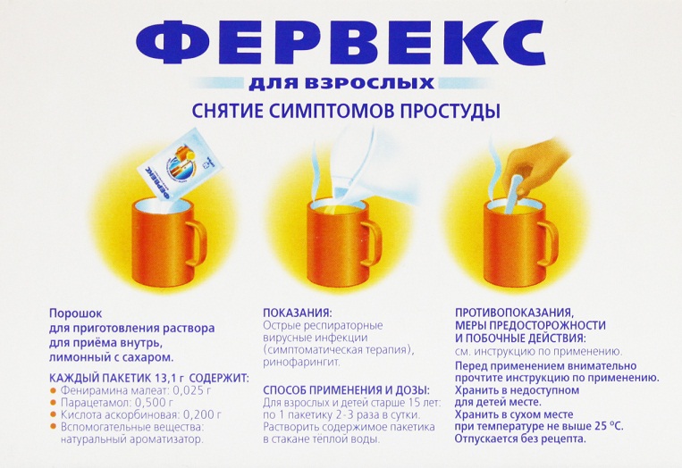 Дополнительно для Фервекса лимонного без сахара: препарат не содержит сахара и может применяться больными, страдающими сахарным диабетом.
