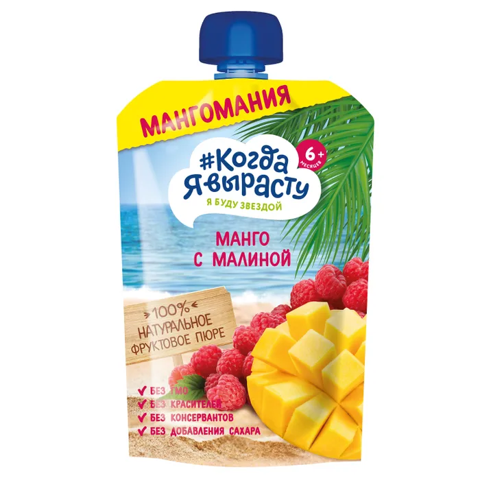 #Когда Я вырасту - первый российский бренд для заботливых мам, которые выбирают для своих малышей полезные и безопасные продукты! Фруктовое пюре "Манго, малина" - это сбалансированный и полезный десерт, рекомендован для питания детей старше 6 месяцев. Серия пюре Мангомания отличается повышенным содержанием в составе пюре экзотических фруктов. Однородная (гомогенизированная) консистенция прекрасно передает вкус и полезные свойства фруктов. Наслаждайтесь вкусами лета! Большая упаковка пюре (180 грамм) - излюбленный перекус не только малышей и деток постарше, но и школьников, подростков, взрослых, соблюдающих здоровый образ жизни. Удобная, современная упаковка - пауч, полностью сохраняет свойства фруктов, занимает мало места в сумочке и холодильнике, её удобно брать в дорогу и на прогулку! Состав: пюре яблочное, пюре из манго, пюре из малины. Изготовлено из концентрированного пюре. Рекомендации по употреблению: продукт готов к употреблению. Для питания детей старше 6-и месяцев, начинайте прикорм с 1 чайной ложки 2 раза в день, постепенно увеличивая к 12 месяцам до 100г. В оригинальной упаковке в микроволновой печи не разогревать. Не оставляйте ребенка одного во время еды без присмотра! Упаковка: пауч, вес 180 грамм. Условия хранения: хранить не более 12 месяцев, при температуре от +2 до +25 °С и относительной влажности воздуха не более 75%. После вскрытия хранить в плотно закрытой упаковке в холодильнике не более суток. В случае употребления пюре ребенком из дозатора, продукт дальнейшему хранению не подлежит. Особенности: - высокое сдержание экзотических фруктов; - 100% натуральный состав, полезный перекус; - без добавления сахара; - гомогенизированное; - не содержит красителей, консервантов; - не содержит ГМО, крахмал; - пауч - удобно брать в дорогу / на прогулку; - можно кушать прямо из упаковки; - произведено в Республике Беларусь.