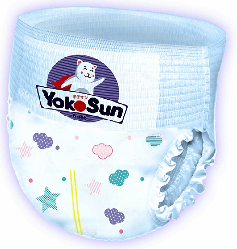YokoSun - универсальные тончайшие подгузники, обеспечивающие комфорт малышу не зависимо от его пола. Главную свою функцию, впитать влагу и удержать ее в себе, они выполняют отлично. Благодаря внутреннему слою, выполненному из двух шаровой 3D ткани, впитывание происходит мгновенно. Гель-абсорбент остается на своем месте даже у малышей-непосед, поэтому внутри подгузника не возникнет пустот. Случайное протекание исключено за счет мягких двойных барьеров, плотно прилегающих к ножке не сдавливая ее. Особенности: необычайно нежный дышащий внешний слой обеспечивает ребенку сухость и комфорт мягкий и эластичный поясок на трусиках облегая плотно тело, не давит на животик изменение цвета индикатора влажности с желтого на синий подскажет родителям, когда необходимо сменить трусики двойные барьеры плотно прилегают к ножкам и надежно защищают от протечек даже у самых активных малышей наличие липкой ленты для утилизации, которая позволяет удобно сворачивать их после