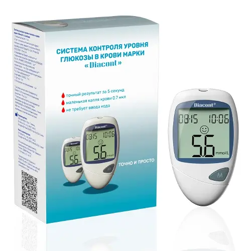 СИСТЕМА КОНТРОЛЯ УРОВНЯ ГЛЮКОЗЫ В КРОВИ DIACONT С ПРИНАДЛЕЖНОСТЯМИ - Глюкометр Diacont (Диаконт)/набор/ - изделие предназначено для количественного измерения уровня глюкозы в цельной капиллярной крови с целью самоконтроля больных сахарным диабетом в домашних условиях и мониторинга эффективности мер по контролю сахарного диабета для медицинских работников по месту лечения пациентов.