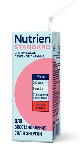 Nutrien® Standard (Нутриэн® Стандарт) со вкусом клубники, лечебное (энтеральное) питание - жидкая готовая смесь объемом 200 мл в упаковке Tetra Pak . К упаковке прилагается одноразовая стерильная трубочка.