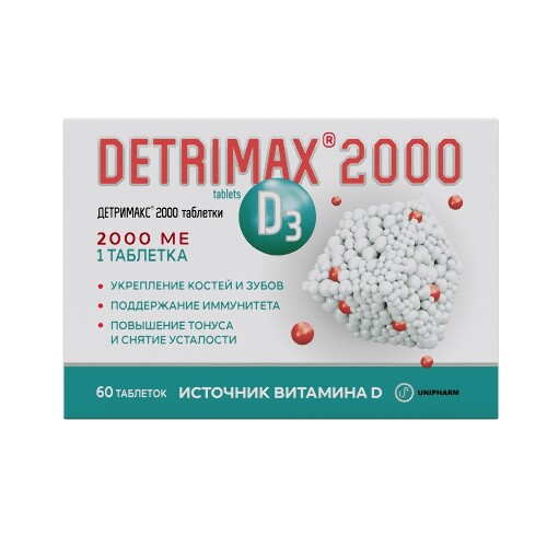ДЕТРИМАКС® 2000 таблетки СОДЕРЖИТ ВИТАМИН D3 (ХОЛЕКАЛЬЦИФЕРОЛ) - ЖИЗНЕННО ВАЖНЫЙ ЖИРОРАСТВОРИМЫЙ ВИТАМИН, НЕОБХОДИМЫЙ ДЛЯ ОБЕСПЕЧЕНИЯ ДЕЯТЕЛЬНОСТИ ПРАКТИЧЕСКИ ВСЕХ ОРГАНОВ И СИСТЕМ ЧЕЛОВЕЧЕСКОГО ОРГАНИЗМА