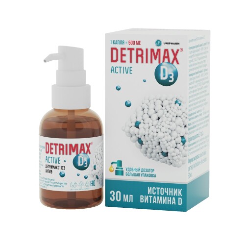 ДЕТРИМАКС® D3 АКТИВ содержит витамин D3 (холекальциферол) - жизненно важный жирорастворимый витамин, необходимый для обеспечения деятельности практически всех органов и систем человеческого организма.