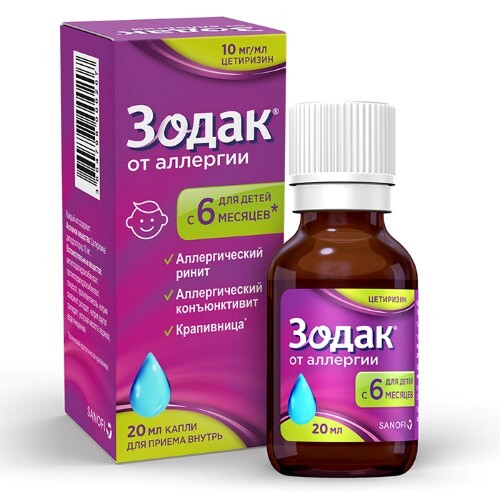 Препарат Зодак® содержит действующее вещество цетиризин, которое относится к группе антигистаминных средств. Цетиризин подавляет действие вещества под названием гистамин, которое вырабатывается в организме при аллергических реакциях и является причиной появления основных симптомов аллергии. Препарат снижает выраженность аллергического воспаления, уменьшает зуд и отек тканей.