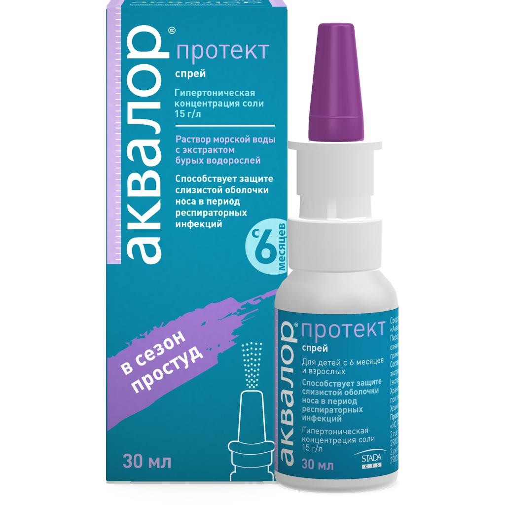 «Аквалор протект» предназначен для поддержания физиологического состояния слизистой оболочки полости носа, которая является первым барьером на пути распространения респираторных инфекций, способствует удалению слизи, уменьшению выделений, размягчению и удалению корок, снижению риска возникновения респираторных инфекций, увлажнению слизистой оболочки полости носа. Регулярное применение средства способствует очищению слизистой оболочки полости носа от патогенных микроорганизмов (вирусных, бактериальных, грибковых), не нарушая биоценоза слизистой оболочки, и её увлажнению. Средство для орошения полости носа «Аквалор протект» — это раствор в пластиковом флаконе, который снабжен устройством, обеспечивающим защиту медицинского изделия от контаминации и не требующим добавления консервантов.