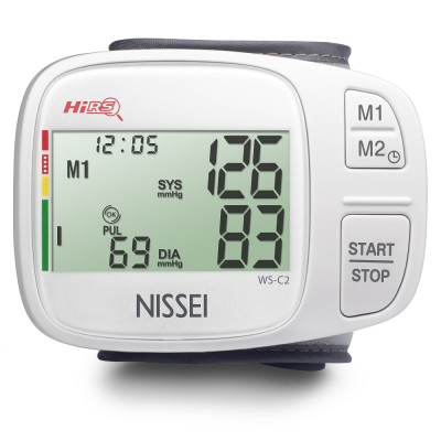 Тонометр за запястье Nissei WS-C2 с системой HiRS и индикатором аномально-нерегулярного пульса. Уникальная форма манжеты M-Cuff. Два блока памяти на 60 последних измеренных значений с функцией вычисления среднего значении.